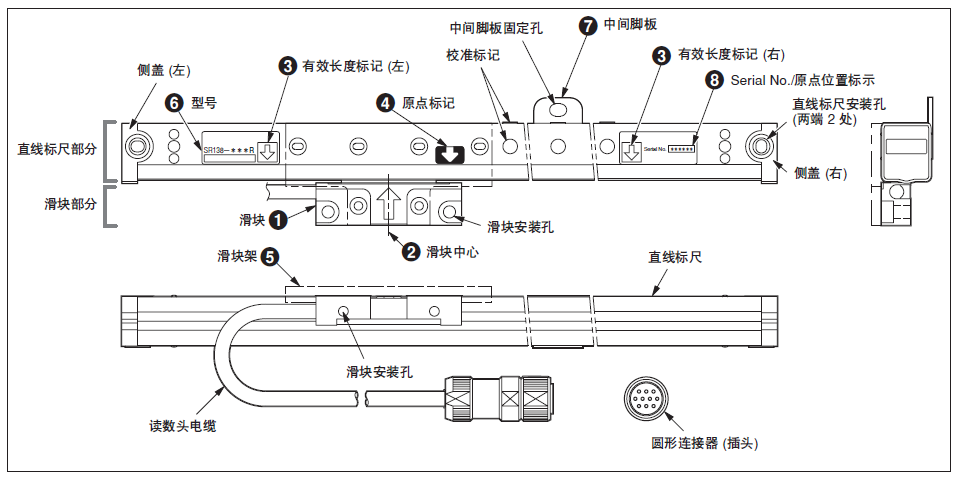 标有本产品的Serial No.和直线标尺的原点位置。GB-ER系列的话,Serial No.与搭配的连接电缆的组合No.为相同编号。