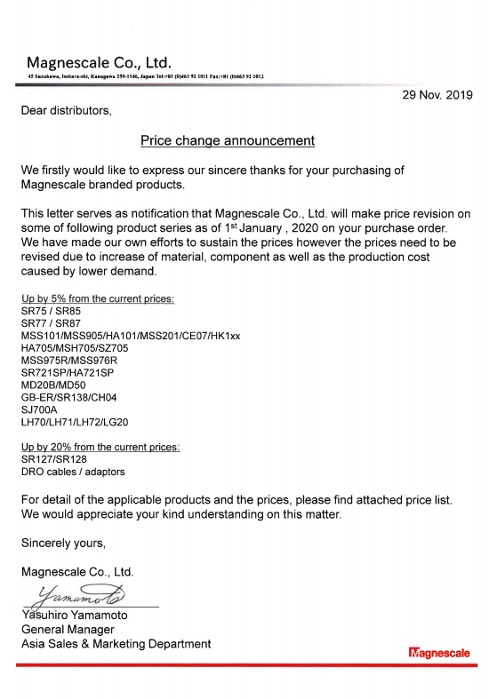 首先在此感谢您们一直对magnescale Co.,Ltd多年的支持,由于产品生产的原材料不断涨价,涨幅已远远超过了公司承受范围,经过公司一再研究决定,对公司产品做出调整决定,自2020年1月1日起,不同产品价格涨幅不同,具体涨幅产品详情如下: