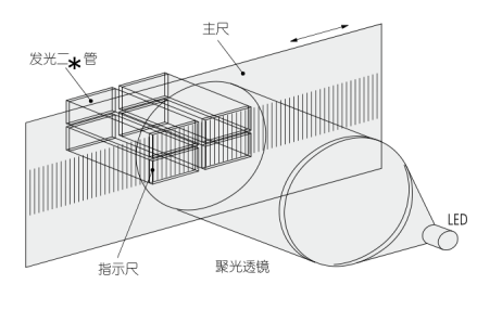 光栅式线性测微计主要使用传动型光电线性编码器,如下图所示。在这个类型中,光源 (LED) 和检测器要素 (发光二 管) 彼此相对,主尺和指示尺 (20µm 间距) 在它们之间。