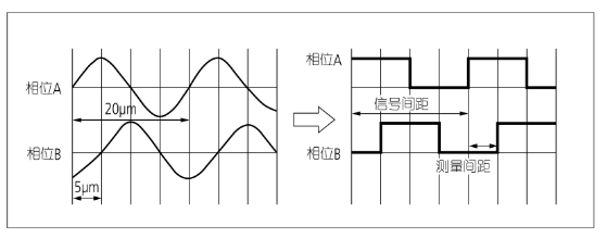 当光栅尺相对检测器移动时,透过指示尺窗口的光线亮度连续变化。同时,输出两个同步的正弦波信号形成 90 度相位差。这些信号被放大和分离 (使用插入的附加波形),并以0.1µm、0.5µm、1µm 和 5µm 的正弦波信号输出。